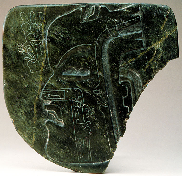 anterior - indice - siguiente El perfil principal de esta pieza muestra la típica deformación craneal de los olmecas, al tiempo que se transforma en un segundo rostro, visto de perfil. Ambos exhiben la mueca pseudo-felina y la cabeza hendida características de las piezas olmecas. Se han esgrafiado tres perfiles adicionales sobre esta pieza, tanto en el interior como fuera del perfil del rostro principal. Placa con cinco perfiles tallados y esgrafiados Olmeca Preclásico medio (800-400 A.C.) Desconocida Piedra verde 15.5 x 16.4 cm. Museo Nacional de Antropología, Ciudad de México. Foto © Jorge Pérez de Lara |