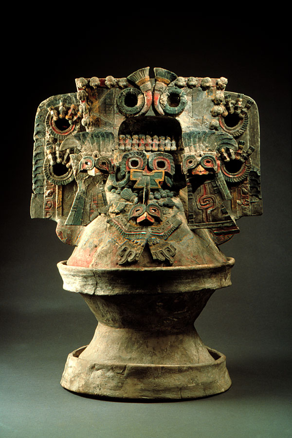 anterior - indice - siguiente Este tipo de brasero compuesto era muy común en Teotihuacan, sitio en el que se han hallado talleres en los que fabricaban en grandes cantidades las diferentes partes y componentes de estos braseros. Este tipo de fabricación "en serie" ha hecho suponer que las piezas se vendían por separado para el armado posterior de los braseros. Brasero con tapa Teotihuacan Clásico temprano (300-550 D.C.) Teotihuacan, Estado de México Arcilla, mica y pigmentos amarillo, rojo y verde/azul 59 x 92 cm. Museo Nacional de Antropología, Ciudad de México. Foto © Jorge Pérez de Lara |