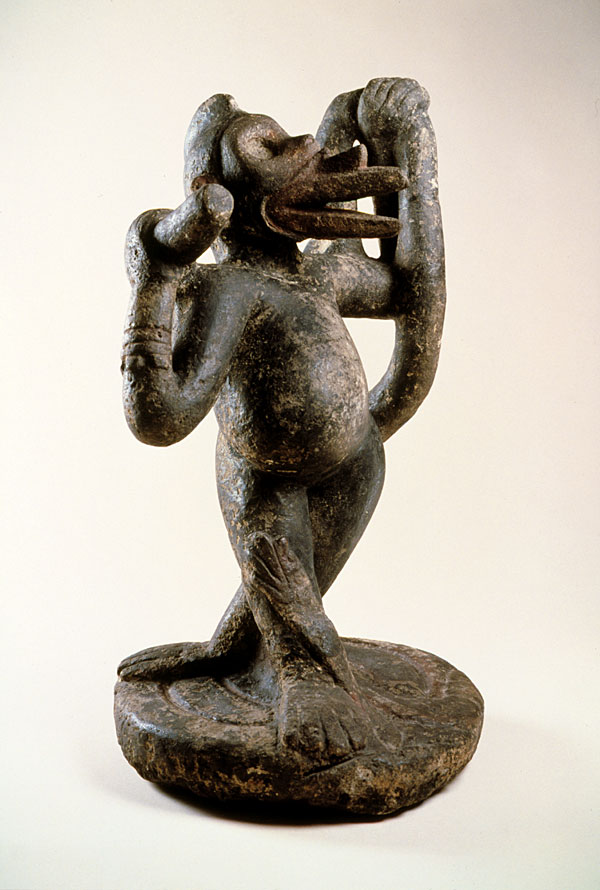 Este mono danzante, que ostenta un vientre prominente (el nombre popular de esta pieza es "la monita preñada") no es más que una de las mejor conocidas advocaciones de Quetzalcóatl como Ehécatl, Señor del Viento. La extraña máscara bucal en forma de pico es el implemento con el cual Ehécatl creaba el viento y es uno de los atributos que lo identifican.