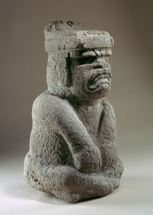 La mayor de dos efigies antropomorfas de estilo olmeca halladas en nichos de fachada en Zazacatla, Estado de Morelos, México. Mide 58 cm. de altura. (Foto de Jorge Pérez de Lara / Precolumbia Mesoweb.)