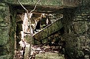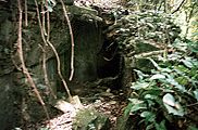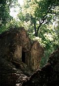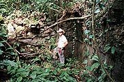 Map 4: South Central Palenque Faster download (56k file) Zoom view (160k file) South Central Palenque includes the Temple of the Jaguar and the areas designated the Blue Wood Group and the Schele Terraces. The foot trail leading to the village of Naranjo cuts between the group as it winds up the mountain side. At the northern end of the Blue Wood Group, Temple XXIV stands 12 meters in height. Descriptively named "Inscriptions Prospect", Temple XXIV looks down over the Temple of the Inscriptions. Extending from its north side are four large terraces which stair-step down the steep hillside to the back of Temple XII. Today, when one stands in front of the Temple of Inscriptions they see the temple's roof comb with wooded hillside towering above. Temple XXIV and its northern terraces, now covered, would have made the entire hillside appear as one massive temple, dwarfing the Temple of Inscriptions below. (Photo) The rest of the Blue Wood Group snakes back to the south following the shape of the flat ridge top and arranged around two main structures, Temples XXV and XXVI. Temple XXVI is in an excellent state of preservation. A measured drawing of its exposed architecture was made and incorporated into the map. A similar drawing made by Blom demonstrates the building was in the same condition at least as early as 1923. On the northeast corner of Temple XXVI's frontal patio lies Stela 3. Broken, fallen, and uncarved, it was easily over looked by earlier projects. Though fragmented and eroded, its dimensions can be estimated at 2.5m high, 70cm wide, and 40cm thick. Directly south of Temple XXVI, on the hillside above, lies the first limestone quarry identified at Palenque. An outcrop of limestone, approximately 30m in length, has partially carved blocks strewn in front of it. It stands to reason that the Blue Wood Group was connected in some way to the exploitation of this nearby resource. |