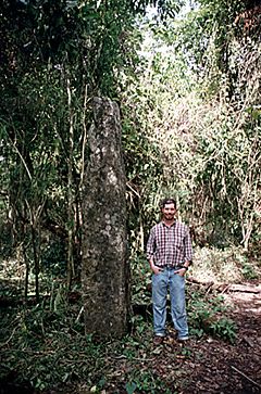 Ed Barnhart with La Picota, the only standing stela at Palenque. This gives its name to the Picota Complex, where the Mapping Project has found extensive architecture and evidences of ancient water management systems. (