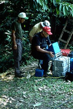 (Left to right) Alcudid Garcia, Lee Langan and Claude "Pete" Patrone (in red hat) at work on the GPR survey.