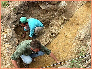 Christopher Powell and a project team worker cleaning Feature 98-4, an ancient water course on the west side of the Temple of the Cross.