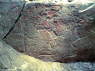 Detail of the south side of the vermillion-painted limestone throne or bench, in the process of being uncovered in Temple XIX.