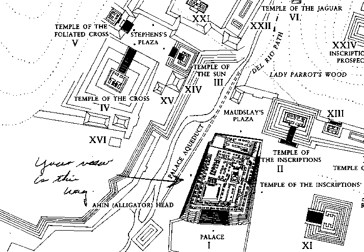 This map of Palenque originally appeared in The Sculpture of Palenque, Volume 1 by Merle Greene Robertson. (Note Dr. Robertson's penciled instructions for the 1997 National Geographic restoration drawing). North is down. Click here to see more of the map, including credits in the upper right corner.