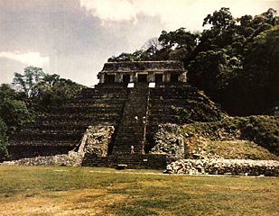 The Temple of the Inscriptions: figures elevated on pedestal masks. The elevation of the figures enables them to be seen at a distance of twenty to one hundred meters.