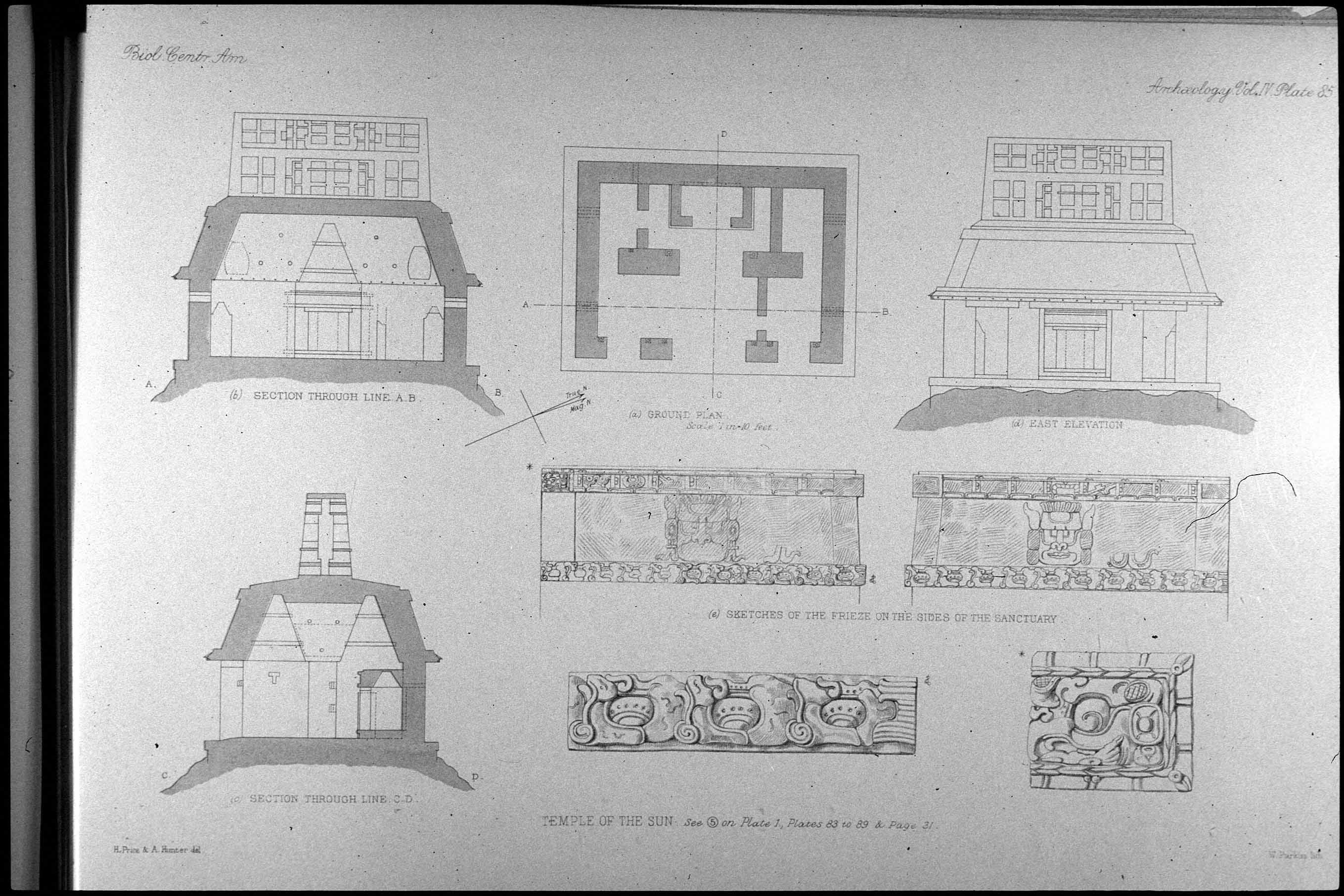 TEMPLE OF THE SUN. (a) GROUND PLAN. (b) SECTION THROUGH LINE. A-B. (c) SECTION THROUGH LINE. C-D. (d) EAST ELEVATION. (e) SKETCHES OF THE FRIEZE ON THE SIDES OF THE SANCTUARY.